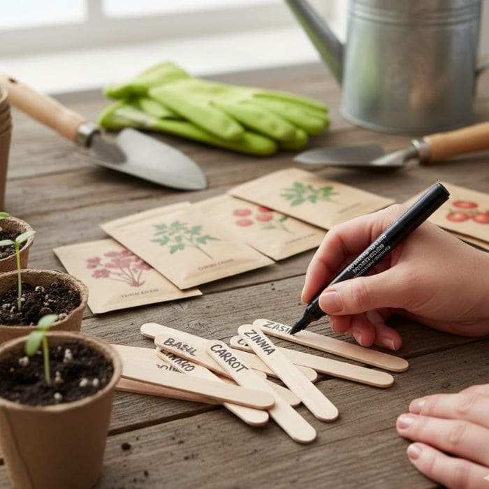 I make my own using plain wooden popsicle sticks, writing the plant name, variety, and sowing date with pencil or a weather-resistant marker. Pencil lasts longer outdoors than most inks, which surprised me at first.