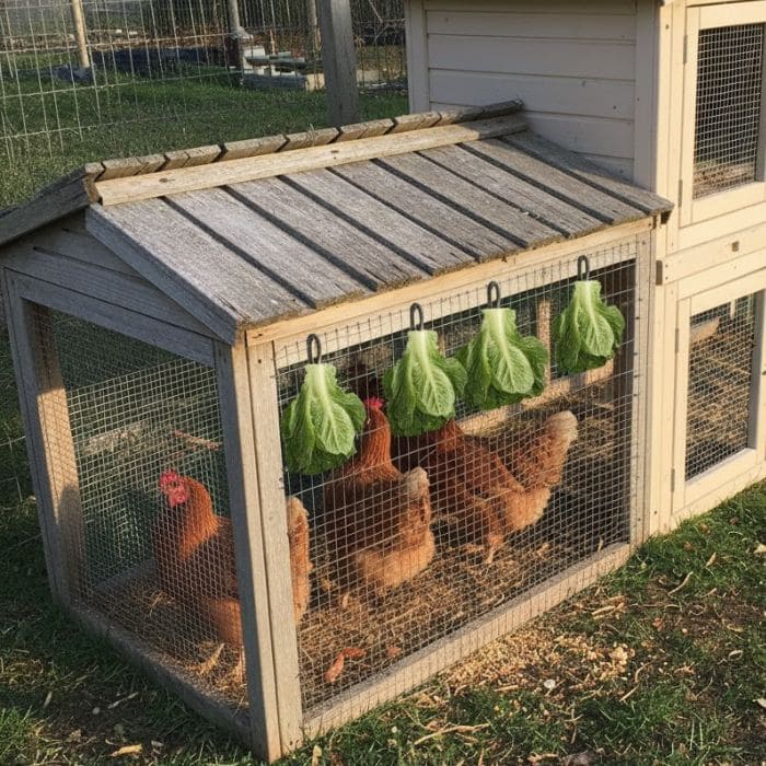 One of the simplest and most effective things I did was hang lettuce heads along the shared fence line, positioning them so both flocks could peck at the same lettuce from opposite sides. This created a calm, shared activity without direct contact.