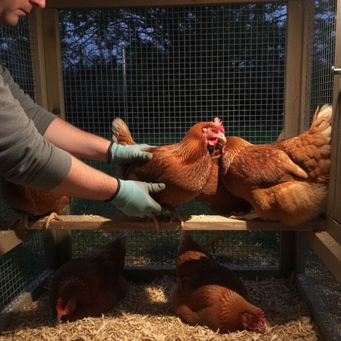 I gently lifted the new birds and placed them on the roost bar near but not directly between established hens. I avoided forcing close contact and allowed space where possible.