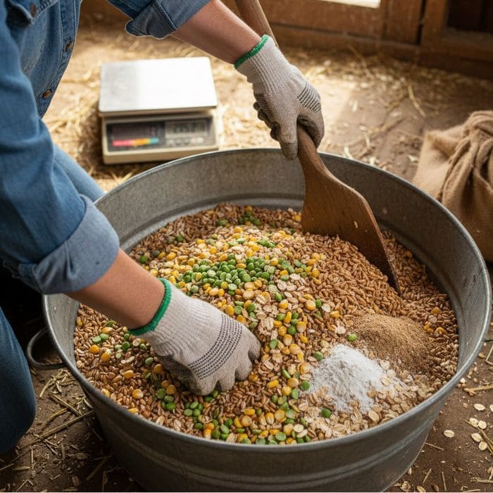 I mix everything in a large, clean container, taking time to blend thoroughly so no single grain settles at the bottom. Chickens are selective eaters, and uneven mixing leads to wasted nutrition.