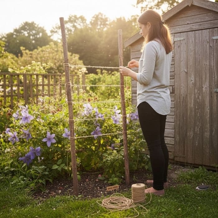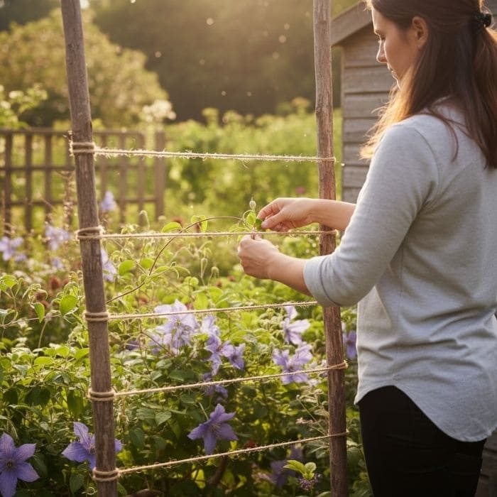 I gently guided a few stems toward the twine, looping them loosely so they could move freely. Clematis does not want to be forced. It wants something light to wrap around, something that lets it decide how to climb.