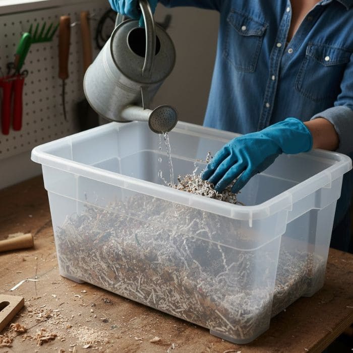 After setting up the bedding, I added Isabella’s worms into the bin. I carefully spread them out on top of the bedding, ensuring they had enough space to move around and settle in. Red wigglers love to dig into the bedding, and after a while, they begin eating their way through the organic matter.