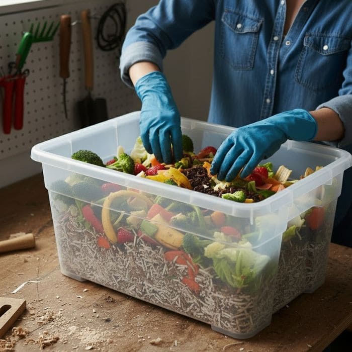 The next step was to start feeding the worms. I added organic kitchen scraps like vegetable peels, coffee grounds, and fruit rinds into the bin. The key here is to feed the worms in moderation, about once a week.