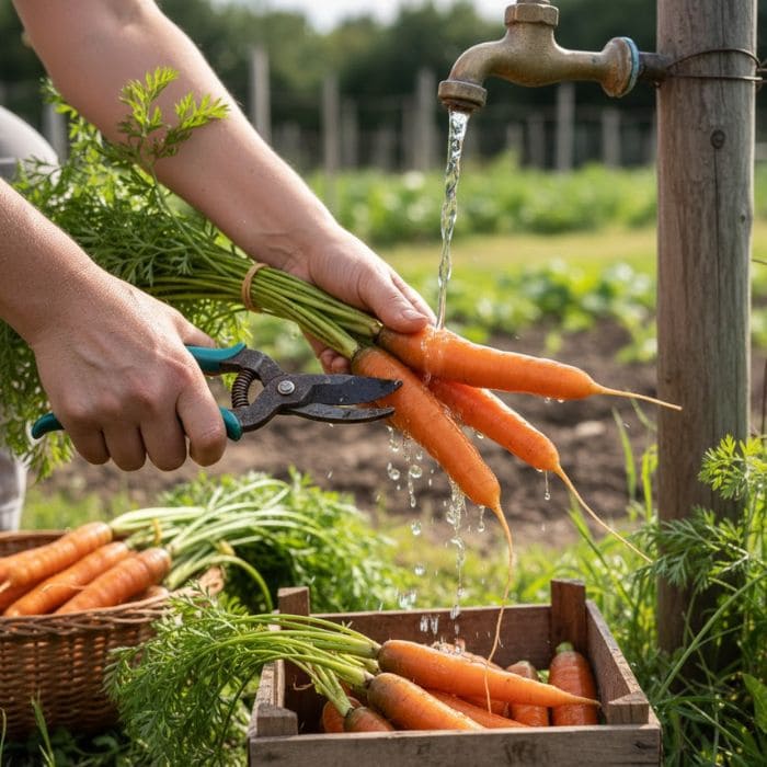 I brushed off excess soil instead of washing them, trimmed the green tops down to about half an inch, and set aside any carrots with cracks or damage for immediate use. Only firm, healthy carrots went into storage.