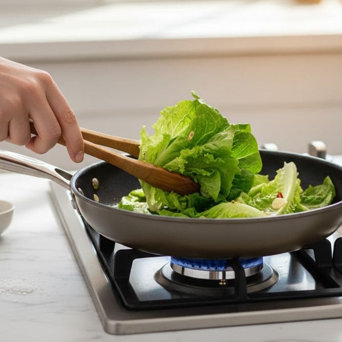 One of our most common methods is a gentle sauté. Evan heats olive oil slowly, adds garlic, and then adds the lettuce just long enough for it to wilt.